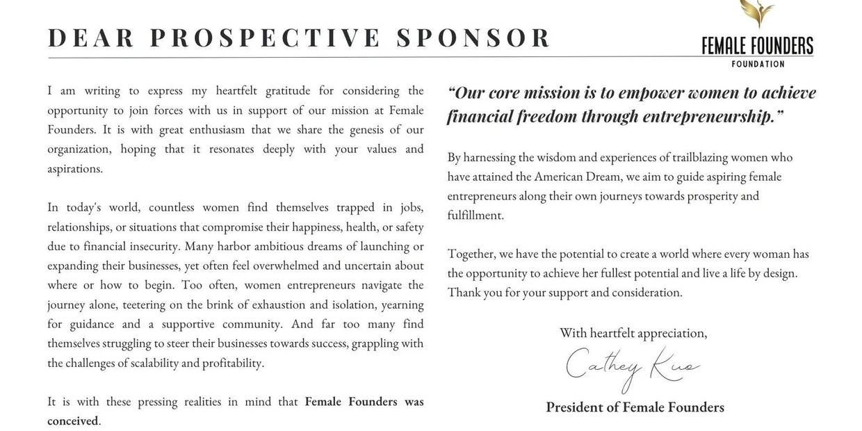 Invest in the Female Founders Foundation today and be part of something extraordinary! Discover our exciting sponsorship opportunities and join the journey towards empowerment and innovation. Let's create positive change together!